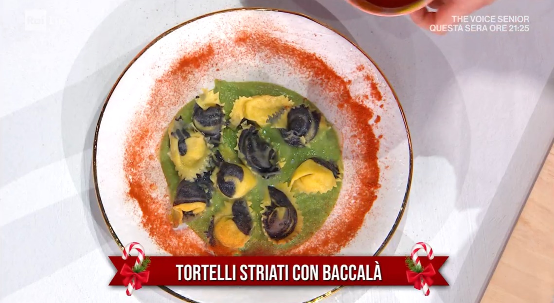 Tagliamo la sfoglia a quadrati e su ognuno mettiamo una noce di ripieno di baccalà. Richiudiamo ogni quadrato a triangolo e diamo la forma di cappellaccio. Cuociamo in acqua bollente e salata.