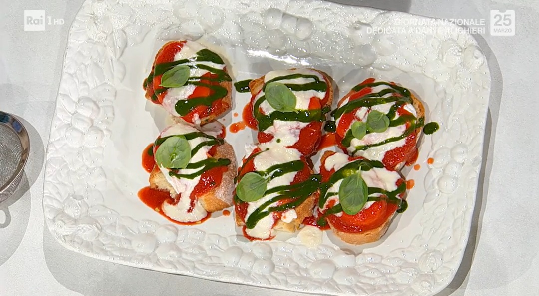 Bruschettiamo il pane. Posizioniamo su ogni bruschetta un uovo in camicia. Coliamo sopra la salsa di pomodoro e la fonduta di parmigiano. Finiamo con salsa al basilico o semplicemente con del basilico fresco.