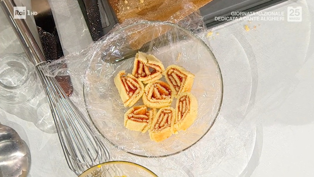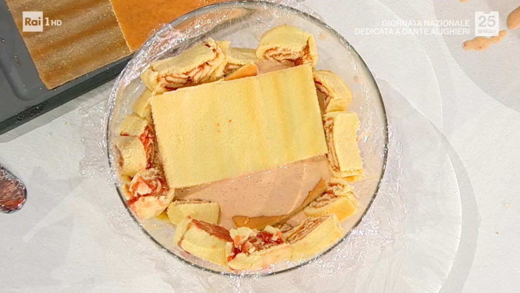 Bagniamo il pan di Spagna ormai freddo e spalmiamo sopra un velo di confettura di fragole. Arrotoliamo su se stesso, ben stretto, ed avvolgiamo il rotolo ottenuto nella pellicola. Lasciamo riposare in frigorifero per qualche ora. Dopo il riposo, lo scartiamo e lo tagliamo a fettine spesse mezzo cm. Con queste fettine, foderiamo una ciotola a mezzasfera coperta con pellicola alimentare.