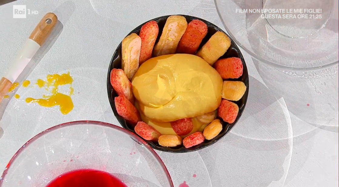 Prendiamo uno stampo dai bordi alti ben imburrato e sul fondo spalmiamo abbondante confettura di albicocche o mele cotogne. bagniamo i savoiardi nei due liquori, uno nell’alchermes ed uno nel rosolio, e li disponiamo sui bordi dello stampo. Formiamo sul fondo (sopra la confettura) uno strato di crema, uno di biscotti inzuppati, ancora uno di crema, di savoiardi e così via fino a riempire lo stampo. Finiamo con i biscotti, copriamo con la pellicola e lasciamo riposare in frigorifero per almeno 2 ore. Capovolgiamo sul piatto da portata.