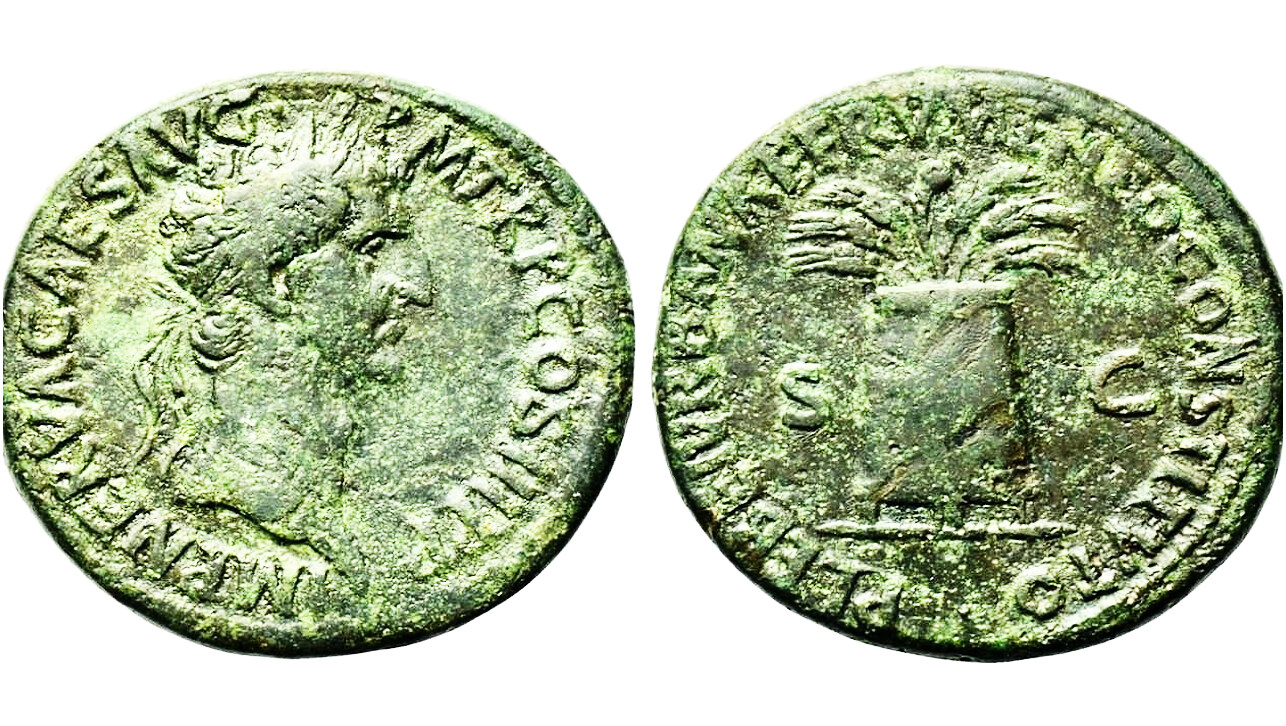Una delle caratteristiche più affascinanti del Sesterzio di Nerva è la varietà delle rappresentazioni al rovescio. Alcuni esemplari commemorano importanti riforme fiscali, come il conio realizzato in occasione della riforma fiscale giudaica, che raffigura una palma. Altri presentano immagini significative, come un modio, un’antica misura di capacità, con sei spighe di grano e l’iscrizione in maiuscolo “PLEBEI VRBANAE FRVMENTO CONSTITVTO”. Inoltre, ci sono esemplari decorati con figure di muli intenti a brucare accanto a un carrello, che raccontano storie quotidiane della vita romana antica.