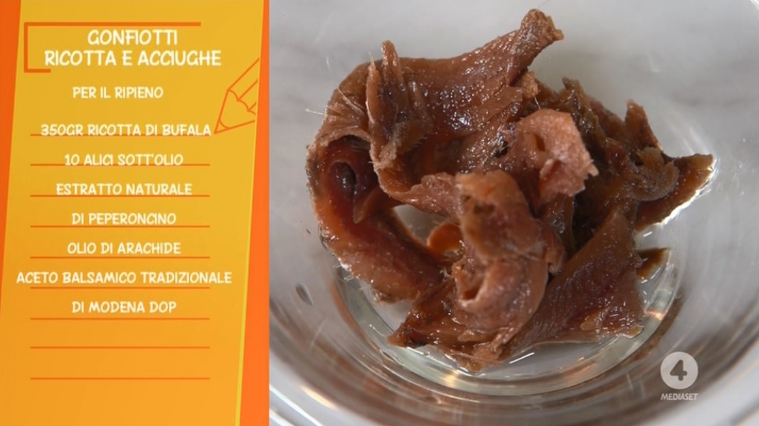 Stendiamo il panetto, ne ricavamo dei cerchi delle dimensioni che preferiamo usando dei coppapasta. Farciamo ogni disco con la ricotta, che prima amalgamiamo con le acciughe sott’olio e un pochino di peperoncino a piacere. Richiudiamo formando delle mezzelune (attenzione a chiudere e sigillare molto bene i bordi usando anche i rebbi di una forchetta) e li friggiamo in olio di arachide bollente e profondo. Scoliamo, asciughiamo e li serviamo con un pochino di aceto balsamico.