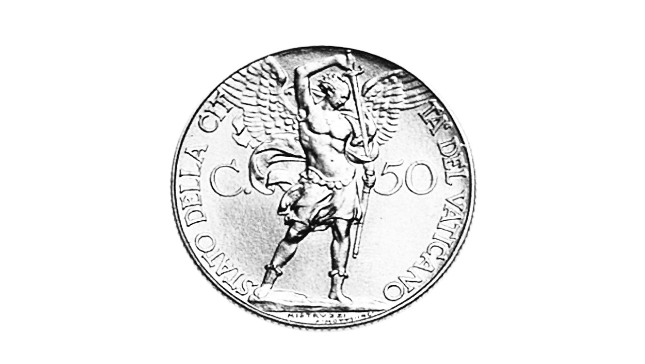 La facciata del dritto è adornata dallo stemma di Papa Pio XI, orlato dalle Chiavi e dalla Tiara papale, con l’anno di conio visibile nella parte inferiore. Il contorno riporta la scritta “PIVS·XI·PONT MAX·AN·(anno di pontificato in numeri romani)”. Sul rovescio, il protagonista è rappresentato in posizione eretta, con una spada nella mano destra e un fodero in quella sinistra. I valori nominali “C. 50” si trovano ai lati, mentre in basso si possono scorgere le firme degli autori “MISTRUZZI” e “A·MOTTI·INC”. Anche in questo caso, il contorno riporta la scritta “STATO DELLA CITTA’ DEL VATICANO”, testimonianza della grandiosità di questa istituzione.
