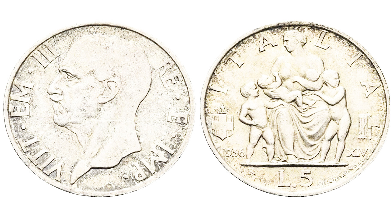 Sul rovescio, troviamo una figura femminile che rappresenta l’Italia, intenta ad allattare uno dei due neonati che tiene in braccio, simbolo di rinascita e futuro. Ai lati della figura, altri due bambini si affacciano, mentre in alto si staglia la parola “ITALIA” e in basso è presente il valore nominale della moneta: L. 5. Alla sinistra, lo stemma sabaudo, seguito dall’anno di conio e dalla lettera “R” che indica la Zecca di Roma. Infine, vi è anche un fascio littorio con l’ascia, l’anno dell’era fascista e la firma dell’autore della moneta, G. ROMAGNOLI, a confermare la sua autenticità.