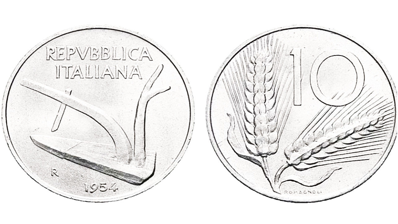 Sul rovescio, vediamo raffigurate due spighe, un elemento distintivo, accompagnato dal numero 10 che rappresenta il valore nominale e dal nome dell’autore G. Romagnoli in basso. Sul dritto, invece, è illustrato un aratro, con la scritta REPUBBLICA ITALIANA in alto, l’anno di conio in basso e la lettera ‘R’ che indica la Zecca di Roma.