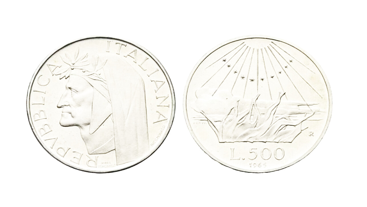 Per celebrare il settecentesimo anniversario della nascita di Dante Alighieri, nel 1965 la Zecca di Stato italiana ha emesso una moneta commemorativa da 500 lire. Composta per il 83,5% di argento, questa moneta è un perfetto esempio di come il numismatico possa fondere arte e storia. Caratterizzata da un diametro di 29 millimetri e un peso di 11 grammi, presenta un design curato nei minimi dettagli, che ne accentua il valore sia culturale sia economico.