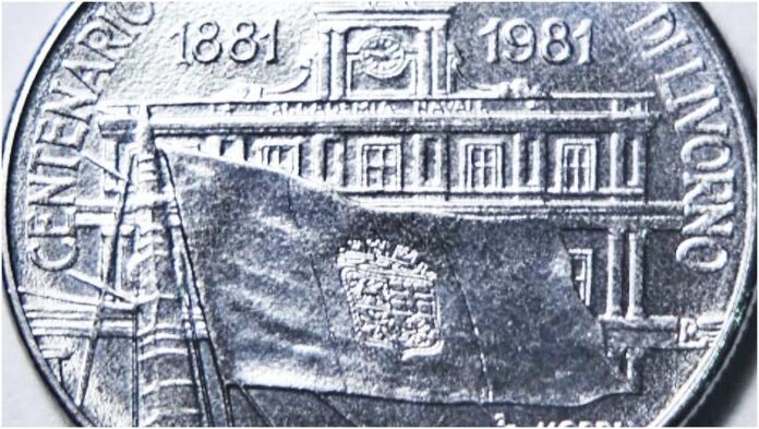Al rovescio della moneta, invece, troviamo un’immagine evocativa della bandiera della Marina Militare Italiana, con sullo sfondo una rappresentazione dettagliata dell’Accademia Navale di Livorno stessa. Sul tetto dell’Accademia si notano le date che commemorano il centenario, 1881 e 1981. La scritta “Centenario Accademia Navale di Livorno” in alto e il valore nominale della moneta in basso completano il design.